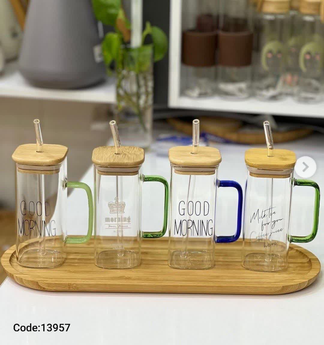 لیوان پیرکس مربع دسته بلند رنگی درب چوبی کد2504